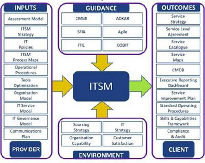 [정의] 고객과의 SLA(Service Level Agreement) 수준에 맞는 품질 유지 위한 프로세스, 조직, 자원, 기술의 종합적 관리 위한 IT 서비스 관리 기법 [목적] - ITIL 기반 IT 서비스 관리체계와 운영방식 도입을 의미 - 궁극적으로 IT 역량과 성숙도 향상 통한 비지니스 가치 재창출 [프레임워크 구성요소]IEC SSSS - ITIL V4, eSCM, CMMI, SPICE, SLA, SLM, SoW, MTTF, MTBF, MTTR 2) eSCM : - 아웃소싱 절차 업무개선 지침 활용, ISO 20000(OUTSOURCING 국제표준) - 아웃소싱 제공업자 능력수준 평가 모델 [구성요소]인조기프 - 인력, 조직, 기술, 프로세스 |