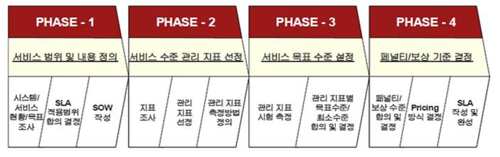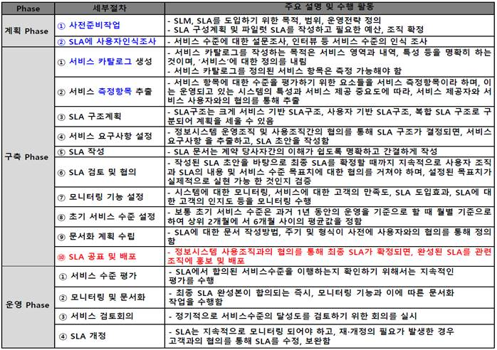 - SLA는 계획, 구축, 운영의 단계로 수행되며 사전에 도입환경에 따라 세부적인 절차의 변경가능