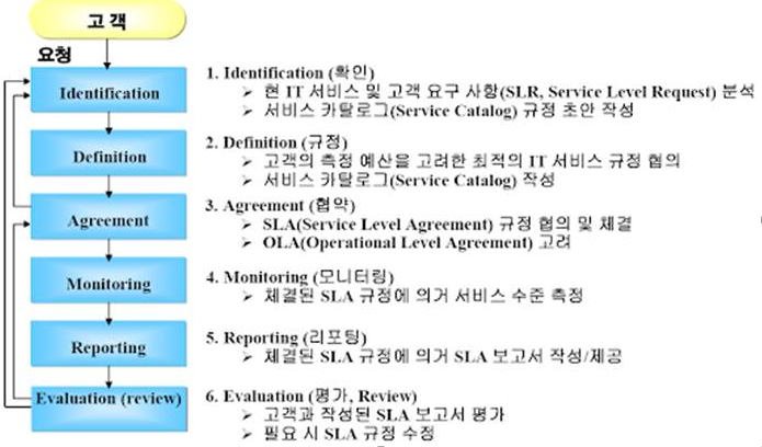 - SLA에서 정의한 서비스에 대해 정확히 성과 측정/평가하고 그 결과 바탕으로 서비스 개선방안 마련하는 과정