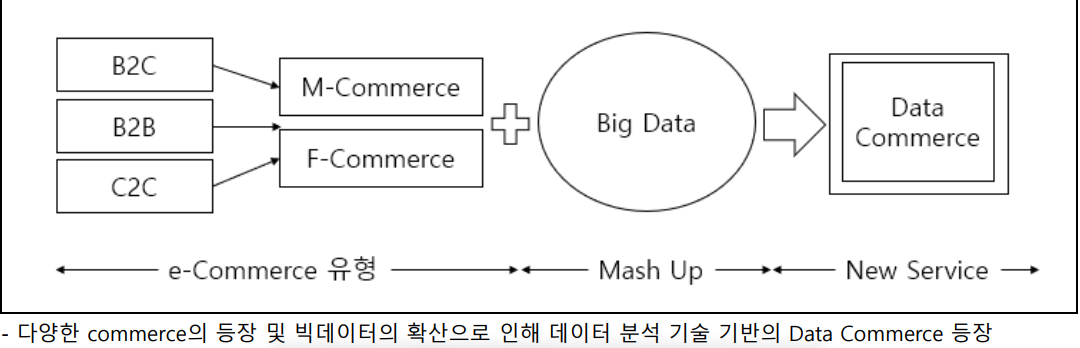 | 데이터 커머스(Data Commerce) | [정의] 데이터 분석 기술을 기반으로 소비자와 상품 데이터를 분석해 맞춤형 쇼핑 정보를 제공하는 커머스 (키워드) 빅데이터, 연관분석, 상관분석, 군집분석, 추천시스템 |