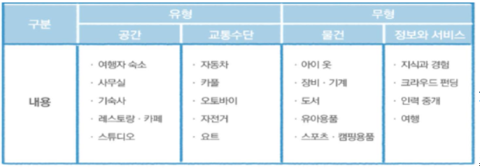 - 개인이 소유하고 있으나 활용하지 않는 물건 또는 지식, 경험, 시간 등의 유·무형 자원을 상호대여 하거나 교환함으로써 거래 참여자가 상호편익과 적정이윤을 얻는 경제활동 방식