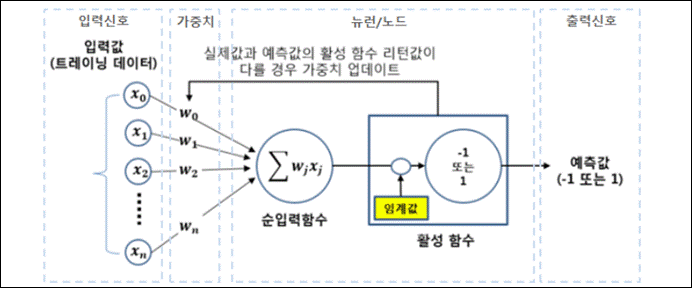 | 가중치(연결강도) | - 활성화 함수의 입력값으로 사용되는 뉴런간의 연결계수 |