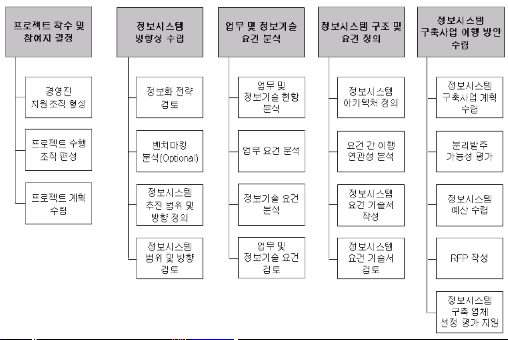 | 정보시스템 구축사업 이행방안 수립 | 정보시스템 구축사업 계획 수립 | - 정보시스템 구축 범위 확정 - 정보시스템 기대효과 및 추진 전략 수립 - 정보시스템 추진 조직 정의 - 정보시스템 구축사업 일정 계획 |