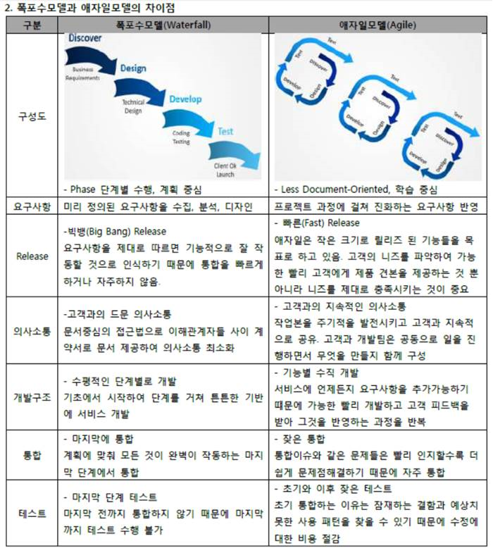 | 단점 | 단계적 진행 | - 앞 단계가 끝날 때까지 대기, 개발완료전에 사용자가 원하는 것을 정확히 알 수 없음 |
