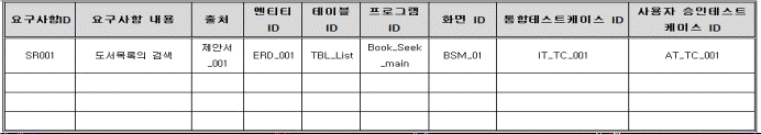 | 요구사항 추적 매트릭스 | - 정의된 요구사항을 각각의 요인에 연결하고 각 요구사항을 프로젝트 생애 주기 전반에 걸쳐 단계적 산출물을 추적하여 관리 하는 문서 |