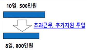 자원추가 | 비용과 시간 사이의 상충 관계를 분석하여 최소한의 자원 추가로 최대 시간 단축 방법을 결정하는 기법 |