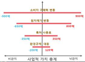 - 민감도가 큰 순서대로 막대그래프로 표시 - 위험의 긍정적/부정적 영향의 정도와 민감도를 표시 |