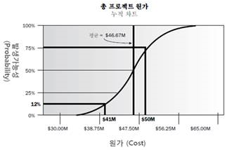 - 이 누적 분포는 프로젝트가 $41M의 산정치 충족할 확률이 12% - 보수적 조직에서 75%의 성공 확률을 원하는 경우, $50M의 예산(약 22% ($50M - $41M)의 우발사태 예비비)이 필요. |