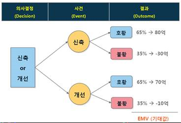 | 정의 | - 각 시나리오의 예상되는 금전적 가치를 산정(=금전적 기대값 분석(Expected Monetary Value analysis))해 평가하여, 최적 의사결정 경로 결정하는 방법 - 여러 대안 조치 과정 중 가장 효과적인 대안 선택하는데 사용 |