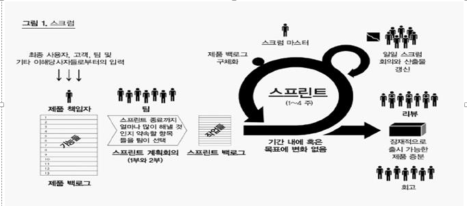 | Daily scrum meeting | 8~10명 정도의 scrum팀은 매일 15분 정도의 회의를 통해 진척관리와 이슈 중심 계획 리뷰 실시 |