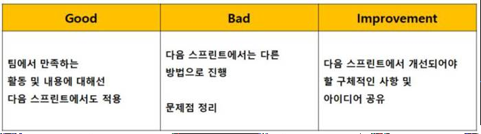 | Sprint Retrospective | - 스프린트 종료 후 수행활동과 개발한 것을 되돌아보고 개선점이나 규칙 및 표준을 잘 준수했는지 검토 | |