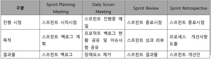 | Daily scrum meeting | - 일일 15분 정도의 짧은 회의이며 어제 한 일, 오늘 할 일, 이슈사항 발표 - SCRUM master는 진척사항 검토 및 이슈사항 확인 |