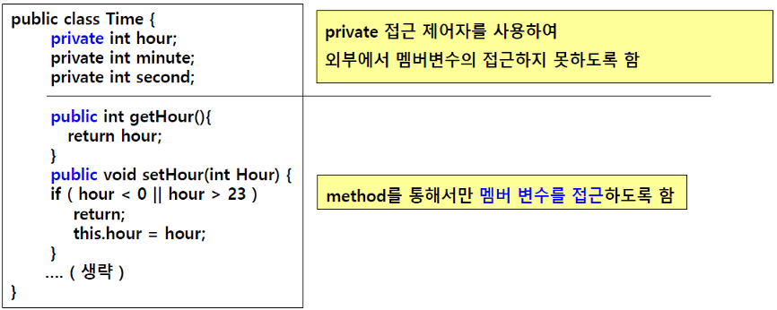 | 정의 | - 캡슐화 방법으로 class 내부 정보를 은닉하고, 접근 제한의 단계를 두어 보안적인 구현 가능 - 클래스 내부에서 사용되는 변수(필드) 들을 private 이나 protected 등으로 선언해 줌으로, 자기 클래스, 혹은 자식 클래스 외에는 직접적으로 제어를 불가능하게 해주는 성질 - 복잡하거나 변경가능 한 부분을 캡슐 내부에 감추고 외부에는 추상화되고 변경가능성이 낮은 인터페이스만을 제공하는 객체지향의 원리 |