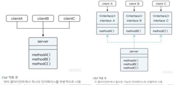 | 특징 | - 인터페이스의 단일 책임을 강조 - 하나의 인터페이스에 해당 인터페이스의 목적에 부합되지 않는 기능을 선언하지 않기 때문에 구현 클래스에서 불필요한 기능의 구현 방지 - 소스 레벨의 가독성 향상 |