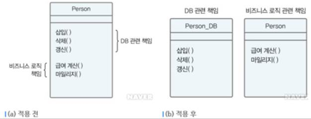 | 예시 설명 | - (a)는 단일책임 원칙을 따르지 않은 클래스로 메서드가 DB관련 메서드들과 비즈니스 관련 메서드들로 구성되어 있음. - 단일책임의 원칙을 지키기 위해 (b)와 같이 각각의 책임을 갖는 두 개의 클래스로 분할 |