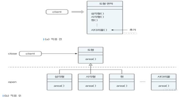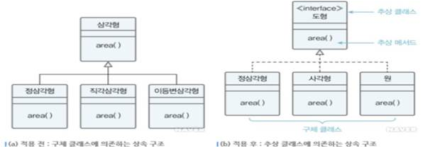 | 예시 설명 | - 원칙을 따르지 않고 설계 시, 삼각형, 사각형, 원 등의 면적을 구하려면 (a)와 같이 각 도형의 면적을 구하는 메서드가 하나의 클래스에 모두 존재하게 됨. - 상속의 개념을 적용하여 (b)와 같이 설계하면 클라이언트가 추상클래스에 의존하므로 구체클래스의 내부 변경에 영향을 받지 않음. |