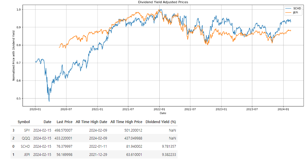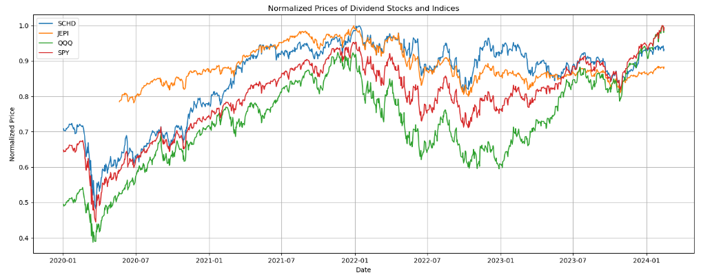 - QQQ와 SPY기준으로 현재 SCHD와 JEPI의 상대적인 주가흐름을 보여줌