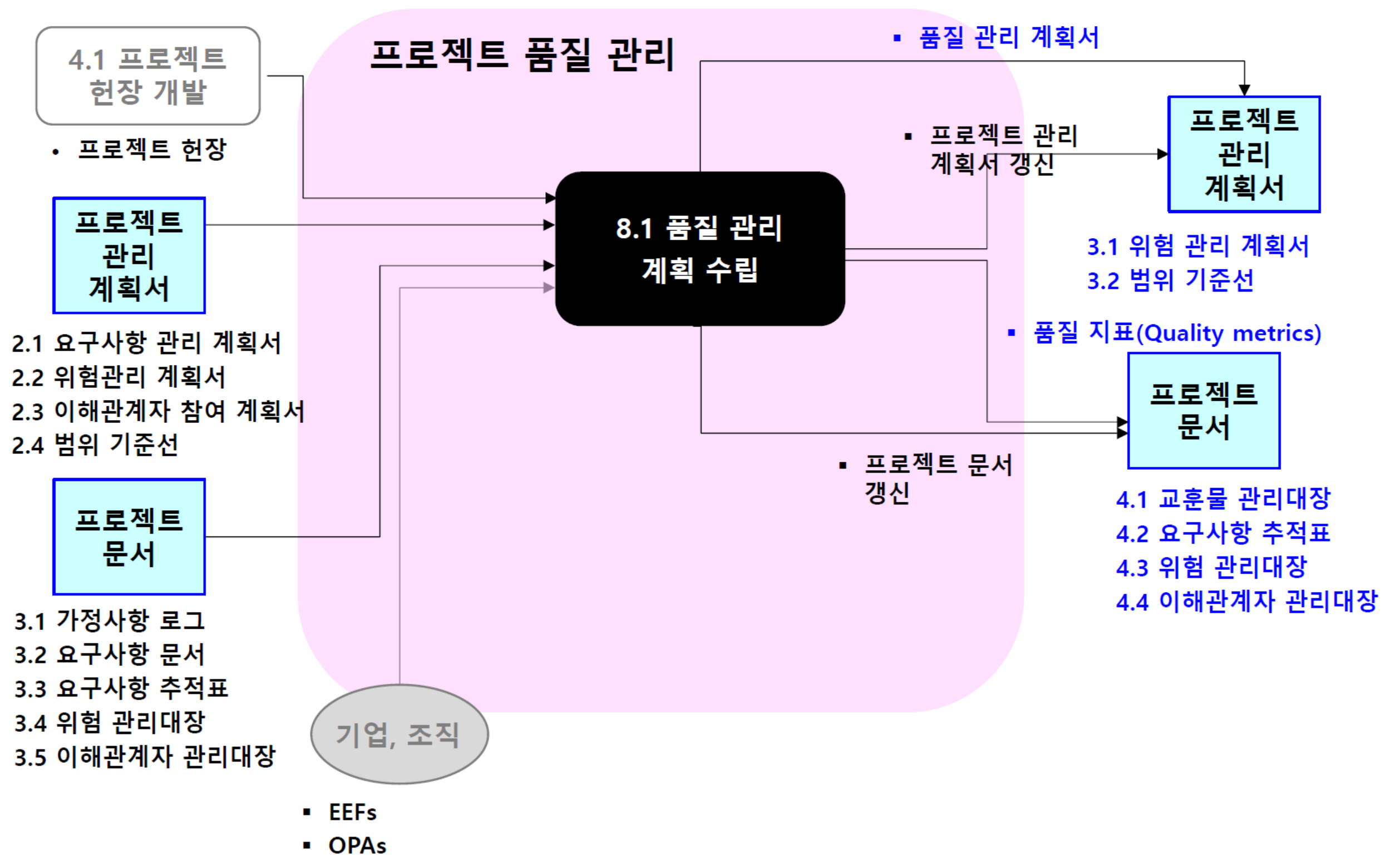 | 입력물 | 프로젝트 헌장 | 프로젝트 헌장에 기술된 품질에 관련된 항목을 찾아 참조 |