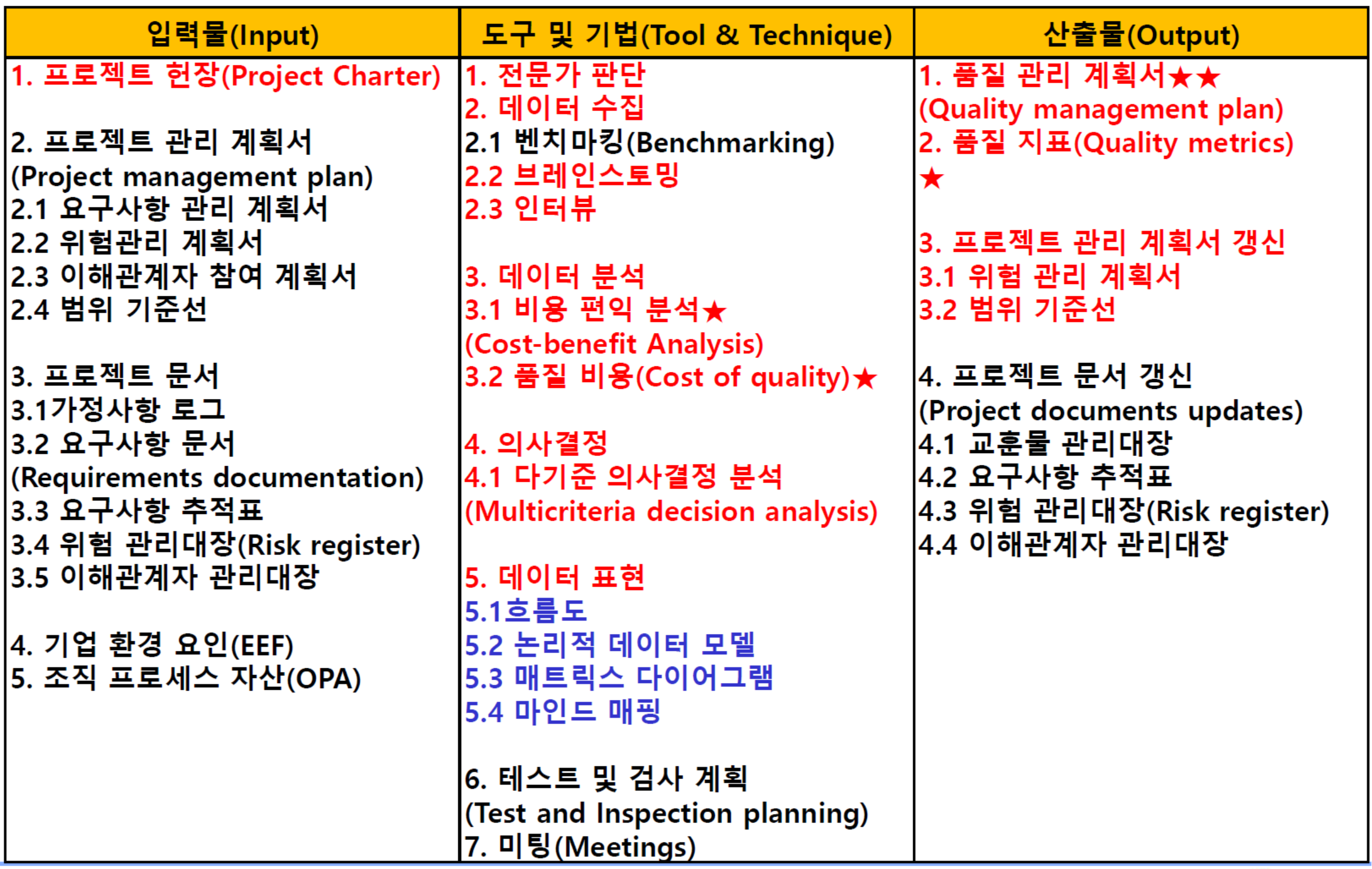 | 키워드(암기) | 입력물 (프로젝트 헌장) 도구 (전문가 판단, 데이터 수집, 브레인스토밍, 인터뷰, 비용편익분석, 품질비용) 산출물 (품질관리 계획서, 품질지표, 프로젝트 관리 계획서 갱신(위험관리 계획서, 범위 기준선) |