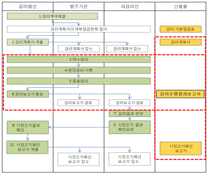 - 감리계약은 감리법인과 공공기관간에 체결하여야 하며 각 감리회차 별로 위 프로세스가 진행