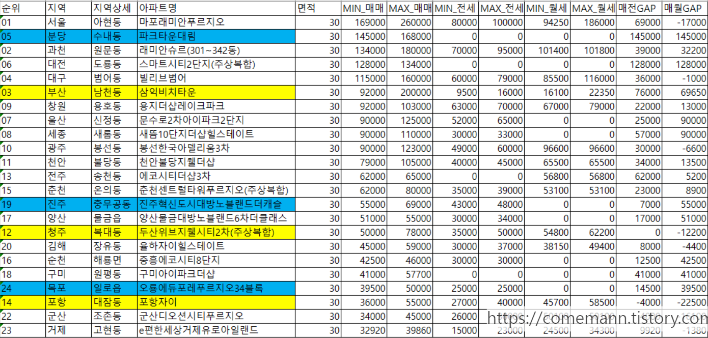 순위 : 기존 급지별 순위를 나타냄(ex-서울 -> 과천 -> 부산 순으로 급지가 분류됨)
