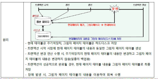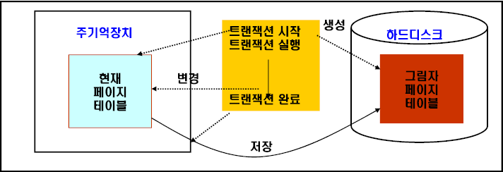 | 회복동작 | - 장애 발생 시, 그림자 페이지 테이블의 내용을 이용하여 회복 수행 |