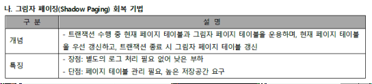 | 복구 | - 그림자 페이지 테이블의 내용을 기반으로 회복 작업 수행 |