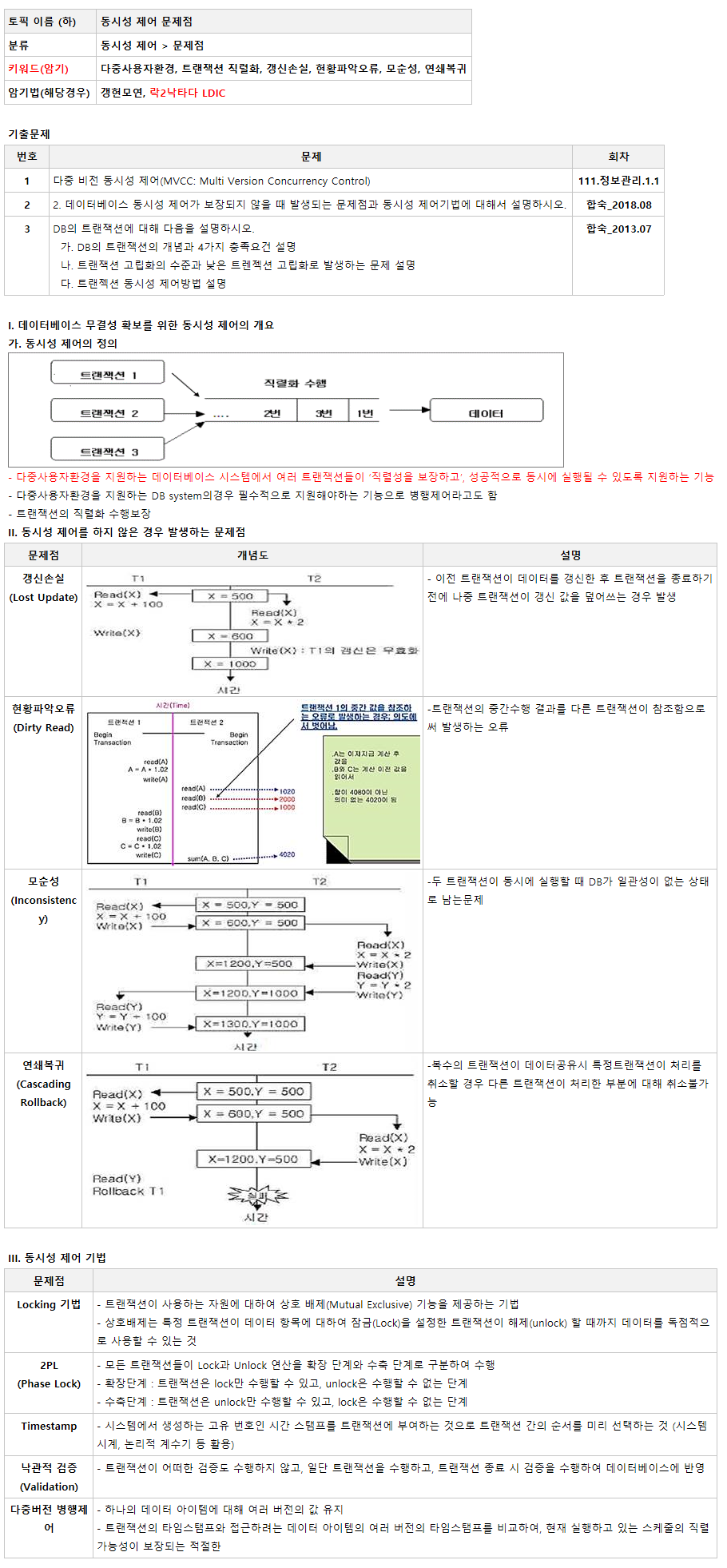| 키워드(암기) | 다중사용자환경, 트랜잭션 직렬화, 갱신손실, 현황파악오류, 모순성, 연쇄복귀 |