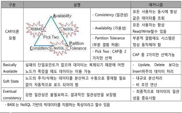 - RDBMS 한계를 벗어나, 고용량의 비정형 데이터를 효율적으로 처리할 수 있는 구조와 유연성을 가진 분산 DBMS