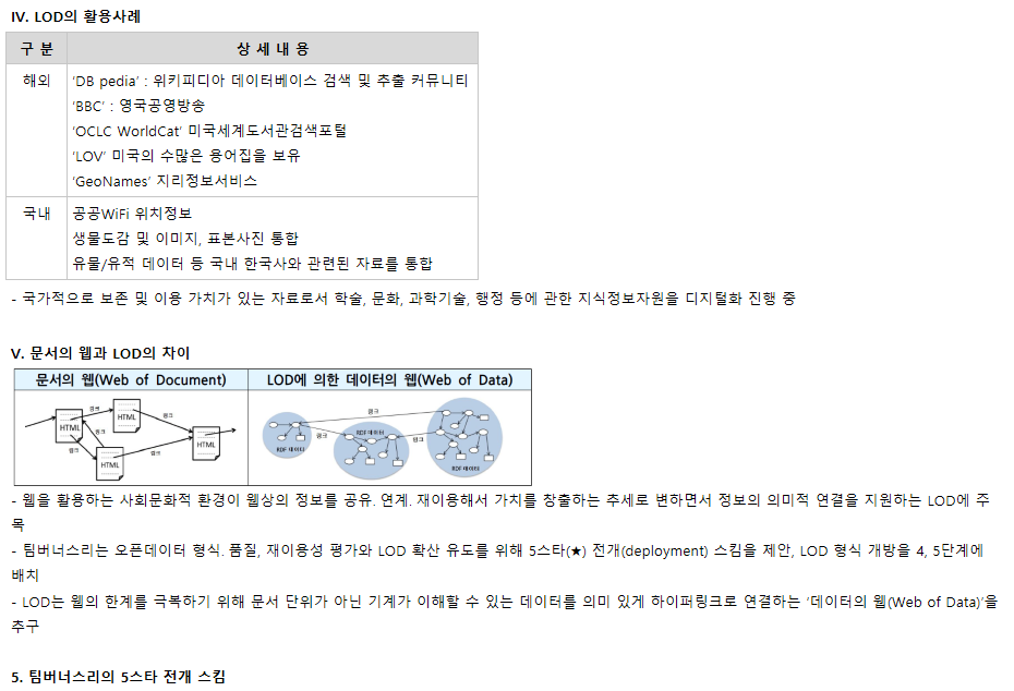 - LOD는 웹의 한계를 극복하기 위해 문서 단위가 아닌 기계가 이해할 수 있는 데이터를 의미 있게 하이퍼링크로 연결하는 ‘데이터의 웹(Web of Data)’을 추구