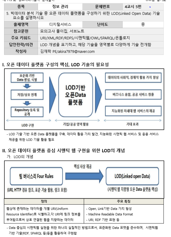 | 2 | 5.빅데이터분석 기술 중 오픈데이터 플랫폼을 구성하기 위한 LOD(Linked Open Data) 기술요소를 설명하시오 | 119.관리.4 |