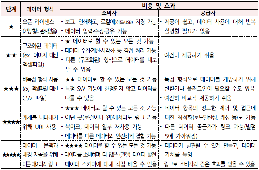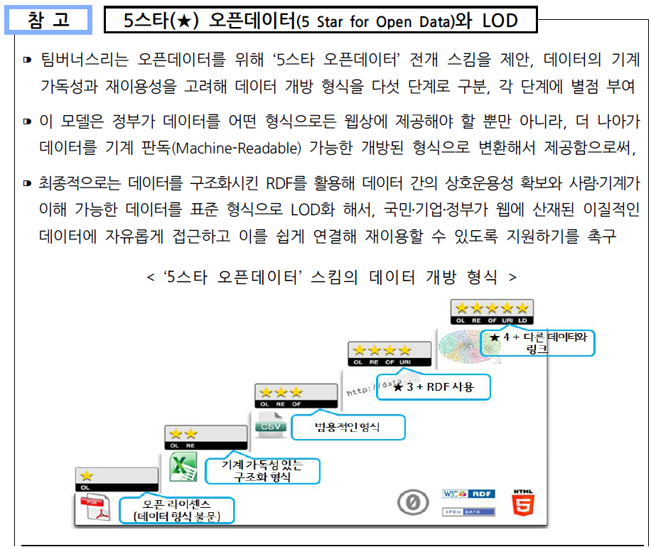 - 팀버너스리는 오픈데이터 형식․품질, 재이용성 평가와 LOD 확산 유도를 위해 5스타(★) 전개(deployment) 스킴을 제안, LOD 형식 개방을 4, 5단계에 배치