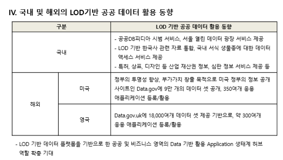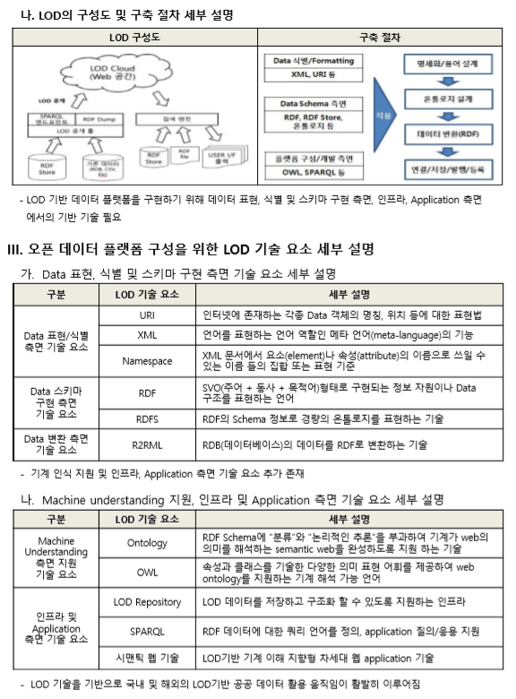 3) LOD는 ‘사람만 이해하는 웹’에서 ‘기계가 이해하는(의미처리) 웹’으로 전환하기 위한 기법으로, 데이터를 누구나 이용할 수