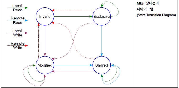 - 멀티프로세서 시스템에서 사용되는 기초적인 캐시 일관성 프로토콜인 MESI 프로토콜 존재