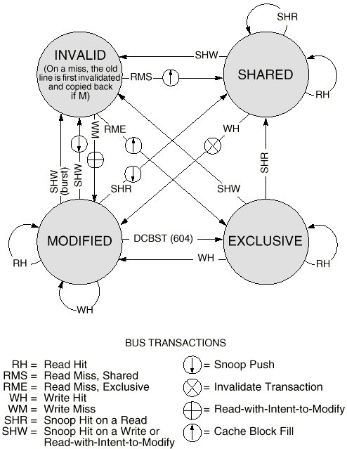 - 실선은 프로세스 동작에 의한 전이, 점선은 다른 캐시 변화에 따른 전이