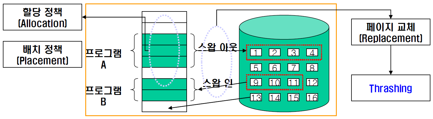 | 키워드(암기) | 프로세스의 일부는 메모리, 나머지는 보조기억장치 주소변환기법: Paging 기법(고정분할), Segmentation(가변분할) 관리정책:할당,배치,호출,교체 |