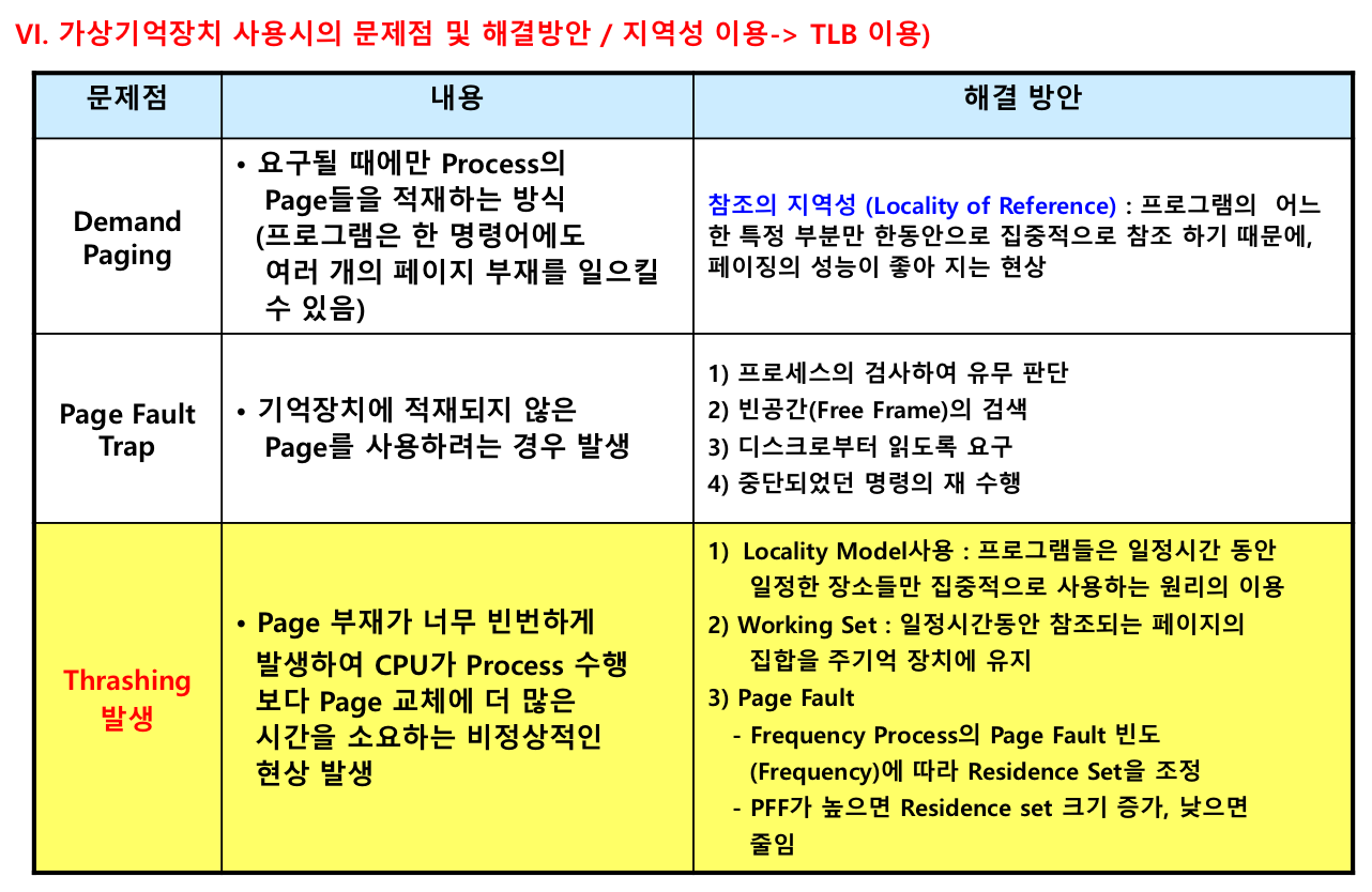 | 해결방안 | - 참조의 지역성(Locality of Reference) : 프로그램의 어느 한 특정 부분만 한동안 집중적으로 참조하기 때문에 페이징의 성능이 좋아지는 현상 |