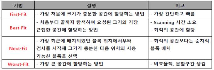 -프로그램의 한 블록을 주기억장치의 어디에 적재시킬 것 인가 | First, Best, Next, Worst Fit |