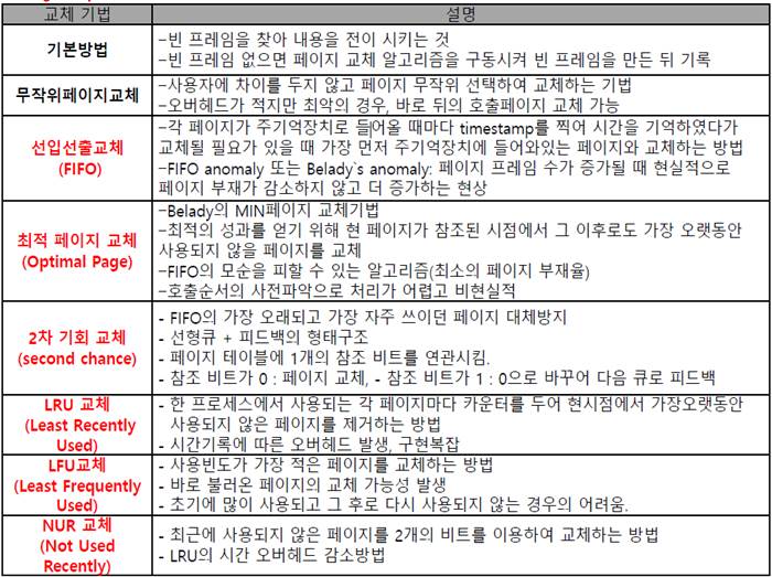 - 주기억장치에 적재 할 공간이 없을 경우 어느 블록을 교체할 것 인가 | FIFO, OPT, LRU, LFU, MFU |