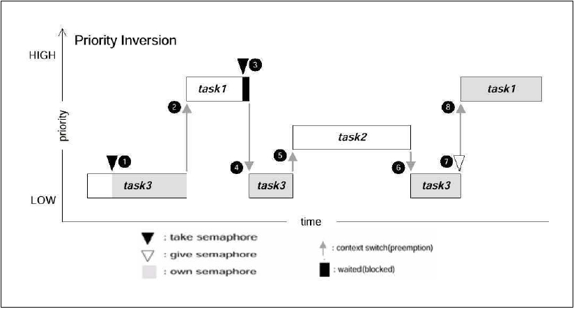 | 5 | 스케줄러에 의해 task2가 수행됨(중간에 중간순위인 task2가 들어와 CPU 차지) 이 때, task3의 우선 순위가 task2보다 높음에도 불구하고 task2가 먼저 수행되는 우선순위 역전 현상이 발생함 |