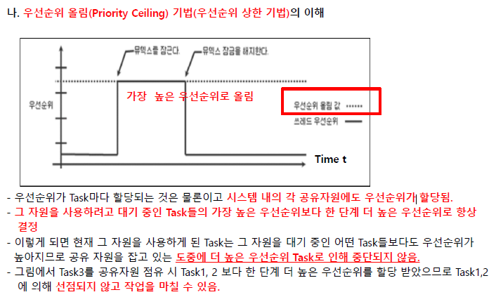 | 키워드(암기) | - 정의 : 높은 우선순위 Task가 임계영역 대기, 블록 되어 수행되지 않는 현상 - 우선순위 역전의 해결방안 1) 우선순위 상속 (Priority Inheritance) 2) 우선순위 올림 (Priority Celling) |