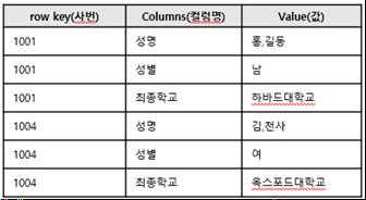 | - Google의 BigTable paper를 기반으로 한 Column에서 작동하는 데이터베이스 유형. - 컬럼명을 Columns 속성에 데이터로 저장하고, Value 속성에는 해당 컬럼의 값을 저장 - 유연성 극대화 - 단점은 타 테이블과 조인이 안 됨, 조인이 필요한 데이터는 하나의 테이블에 중복으로 관리하여 처리 속도 향상 (관리 어려움) 예) HBase, Cassandra, HBase, Hypertable 활용) data warehouses, business intelligence, CRM, Library card catalogs |