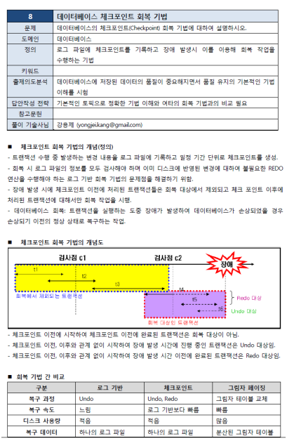 | 1 | 8. 데이터베이스의 체크포인트(Checkpoint) 회복기법에 대하여 설명하시오 | 105.관리.1 |