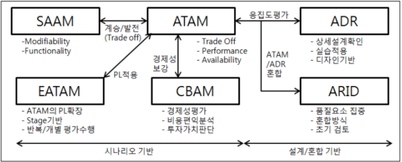 | 키워드(암기) | 소프트웨어 아키텍처의 정방향 분석, 소프트웨어 아키텍처의 역방향 분석, SAAM, CBAM, ATAM, EATAM, ADR, ARID |