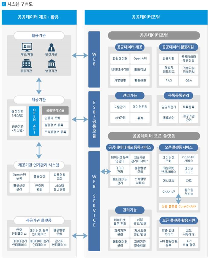 | 공공데이터 플랫폼 | 공공데이터의 개방 활용과 효율적 서비스를 위해 데이터를 편리하고 손쉽게 개방, 활용케 하는 오픈소스 기반 플랫폼 |