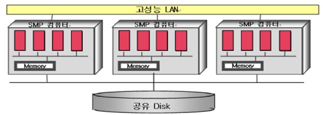 - CPU, 메모리를 가진 각 SMP노드들이 공유 Disk를 사용, 하나의 시스템 이미지를 가지며 노드간 고성능 LAN 통해 통신