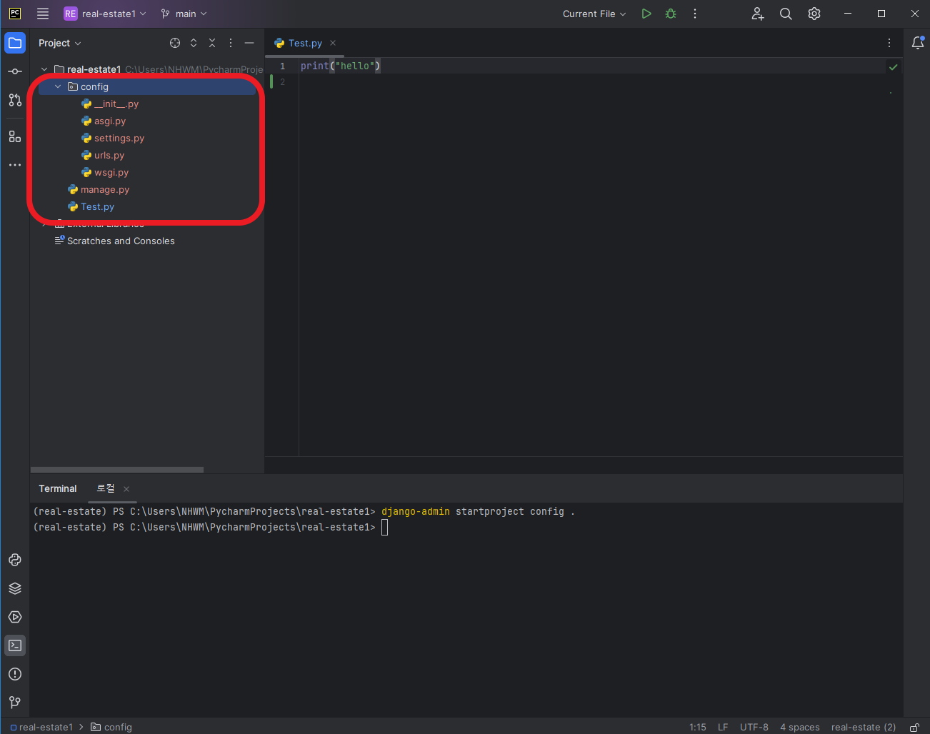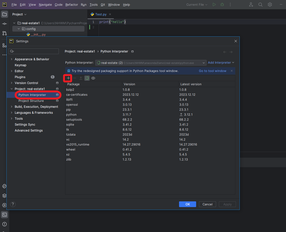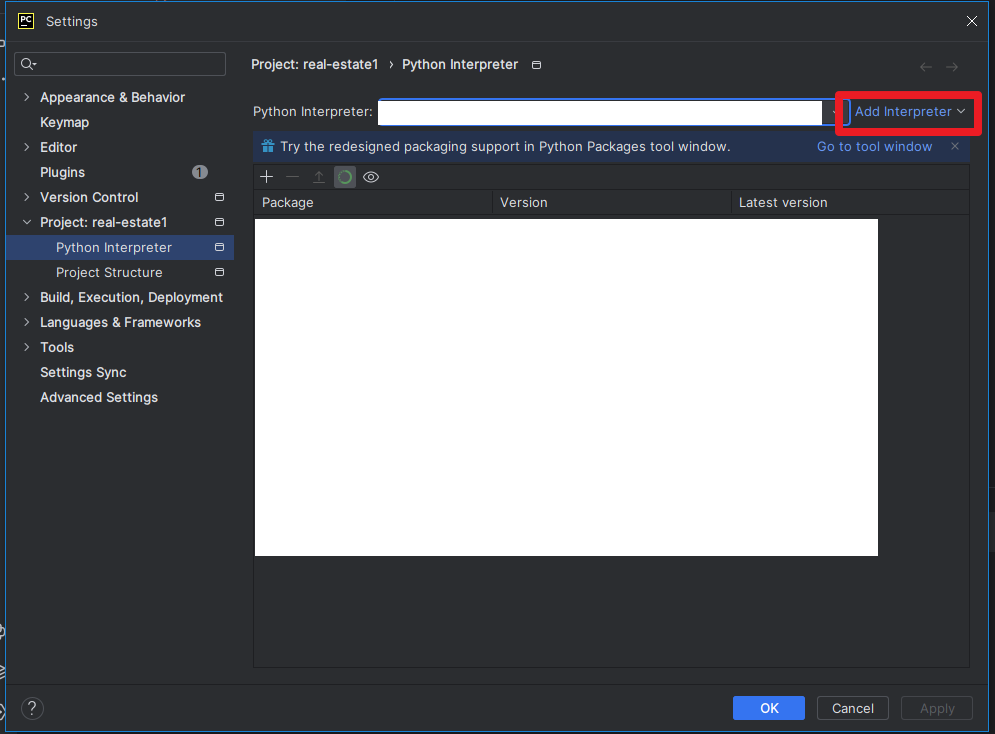 - Python interpreter를 확인하고, 프로젝트에 맞는 인터프리터가 선택되었는지 확인합니다.