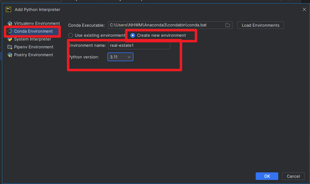 - Environment name은 사용할 가상환경 명, Python 버전은 되도록 최신을 선택.