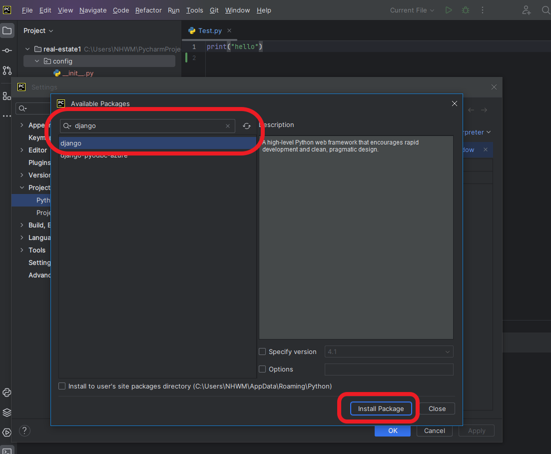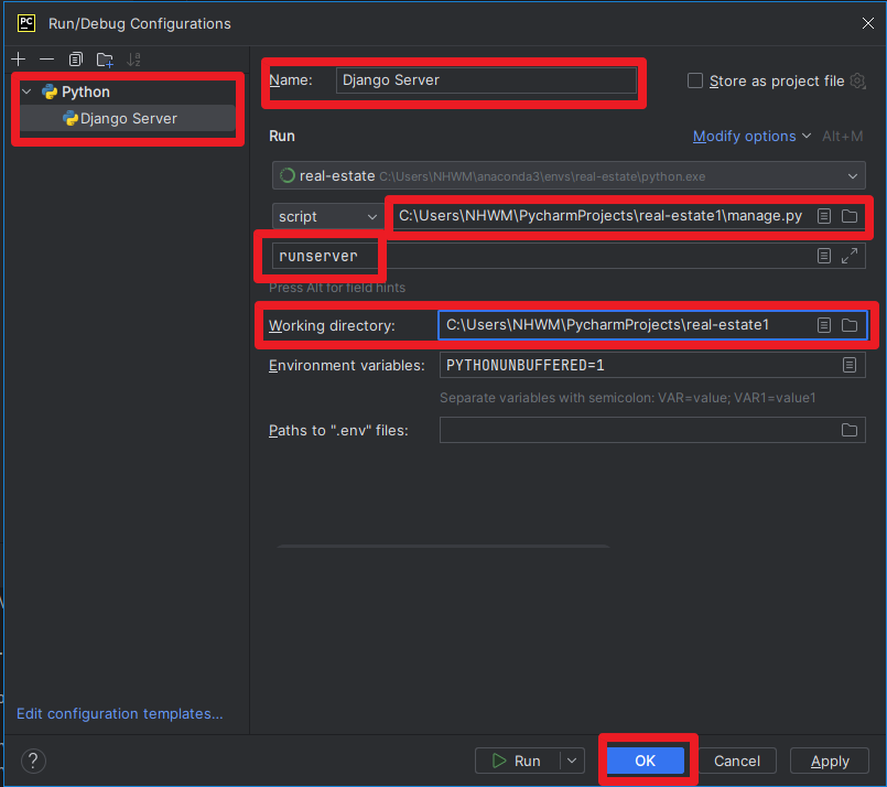 - Script path에서 manage.py 파일을 찾아 선택합니다.